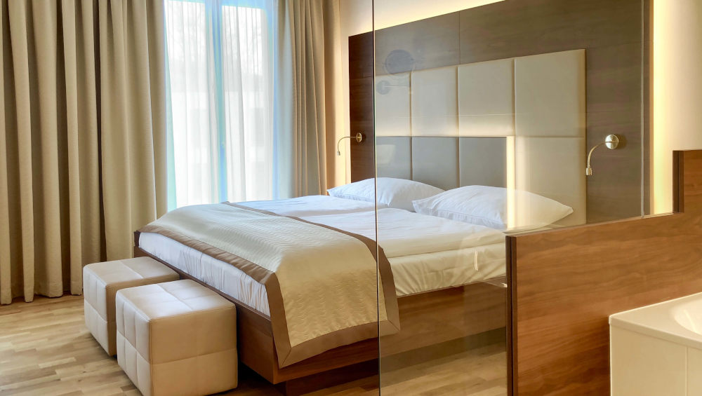 Die sechs Junior-Suiten mit einer Größe von 45 m² haben eine zusätzliche abgetrennte Sitzlandschaft mit eigenen Flachbildschirm sowie eine Espressomaschine.